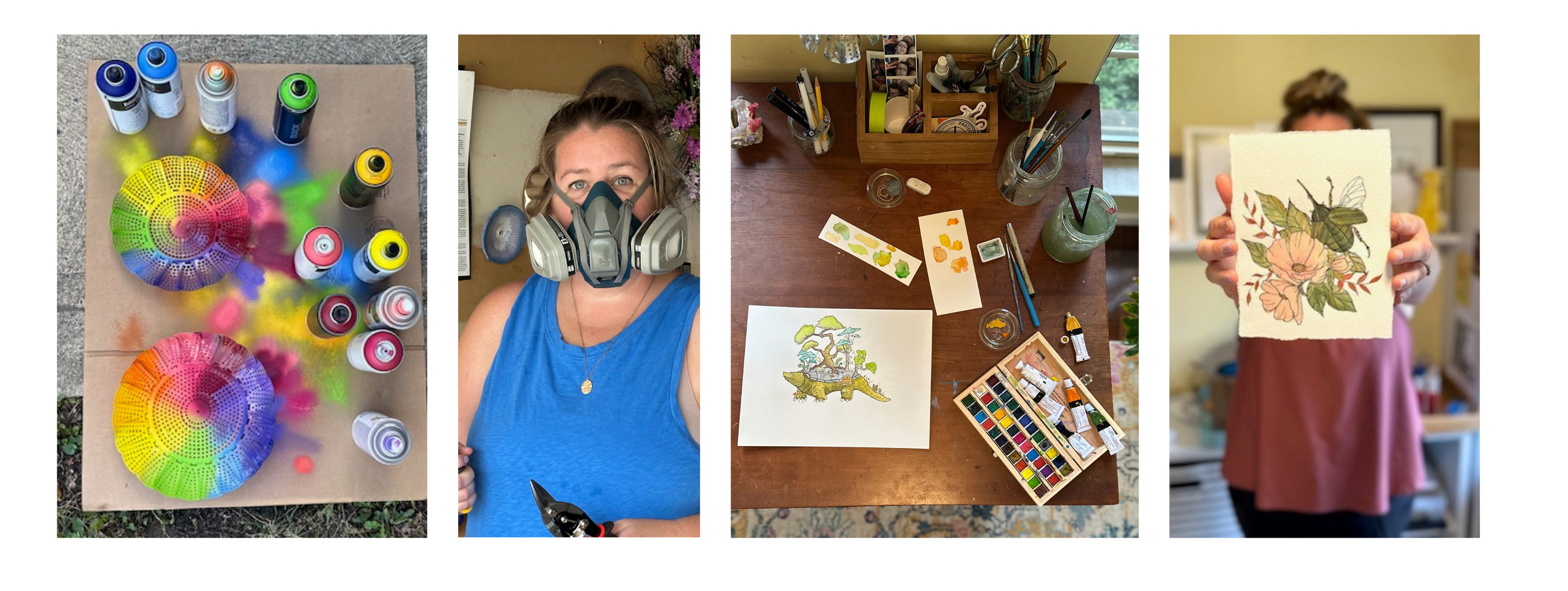 I usually work in watercolor late at night when the rest of my house is asleep. The process is calm, quiet and results in just a few paint brushes and pickle jars of water to clean up.